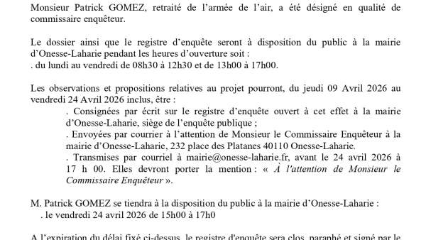 AVIS D’ENQUÊTE PUBLIQUE : ALIÉNATION D’UNE PARTIE DE VOIE COMMUNALE SUR LA COMMUNE D’ONESSE-LAHARIE