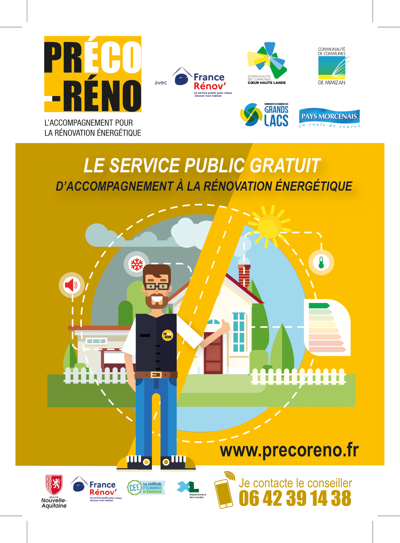 Pour accompagner les ménages dans la rénovation thermique de qualité de leur logement, la Communauté de Communes Cœur Haute Lande et la Communauté de Communes de Mimizan ont lancé, en décembre 2017, la plateforme de rénovation thermique PrécoRéno : guichet unique gratuit. La Communauté du Pays Morcenais (comme celle des Grands Lacs) a choisi de rejoindre cette plateforme. PrécoRéno est donc votre GUICHET UNIQUE en matière de rénovation énergétique