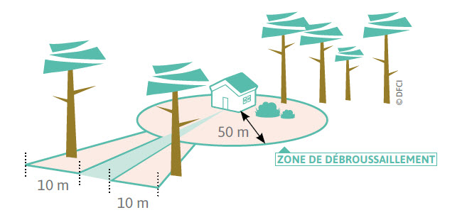 50 m aux abords des constructions,10 m de part et d’autre des voies privées d’accès aux constructions,